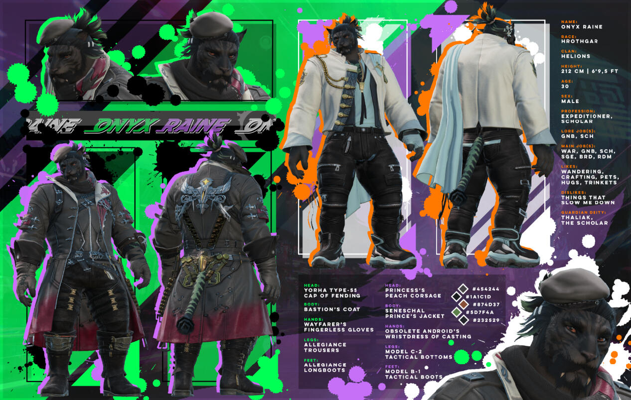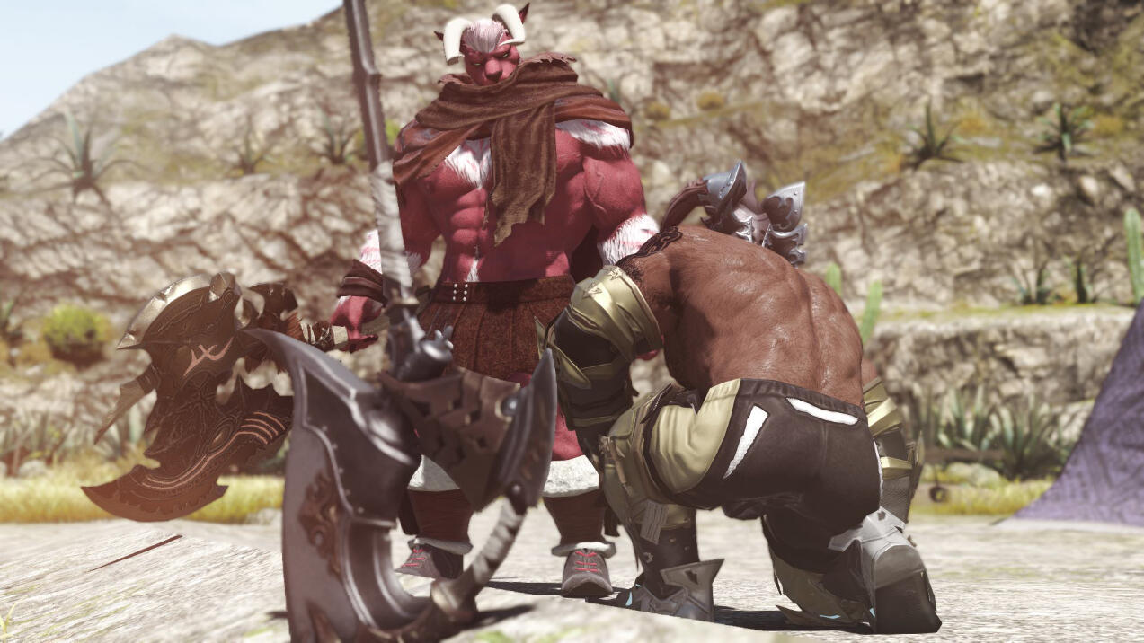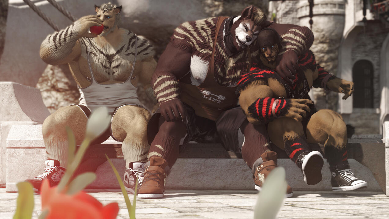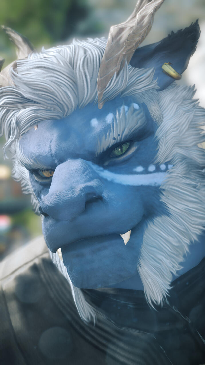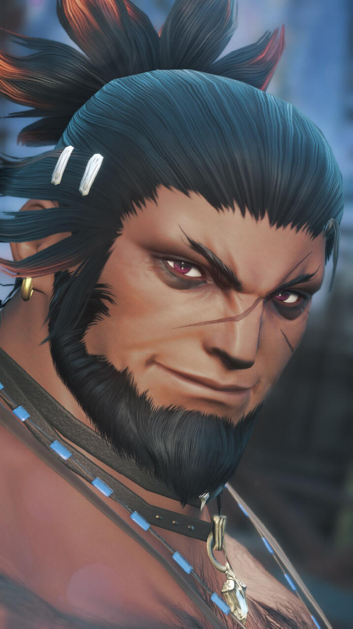 Rogahr, a traveling adventurer who loves fighting and action. He met a younger Ga'oh during his pugilist days and is still friends with him till this day. One time he met a bunch of furred fellows and one of them eventually became his partner in life! Recently Rog met a very old hrothgar with behemoth heritage and decided to challenge him, but he lost. Now that behemoth, Malgamoth, became his new master to teach him the old and forgotten techniques of a New World warrior.
