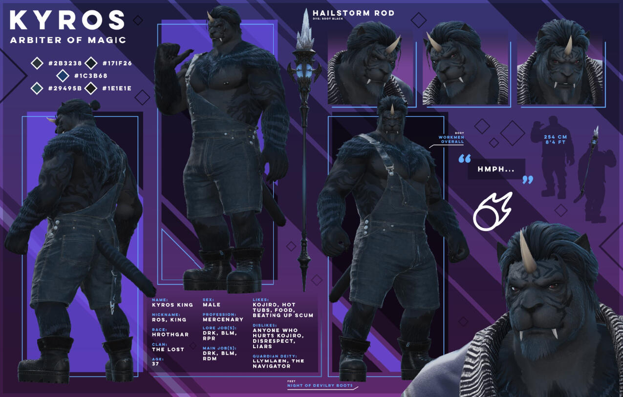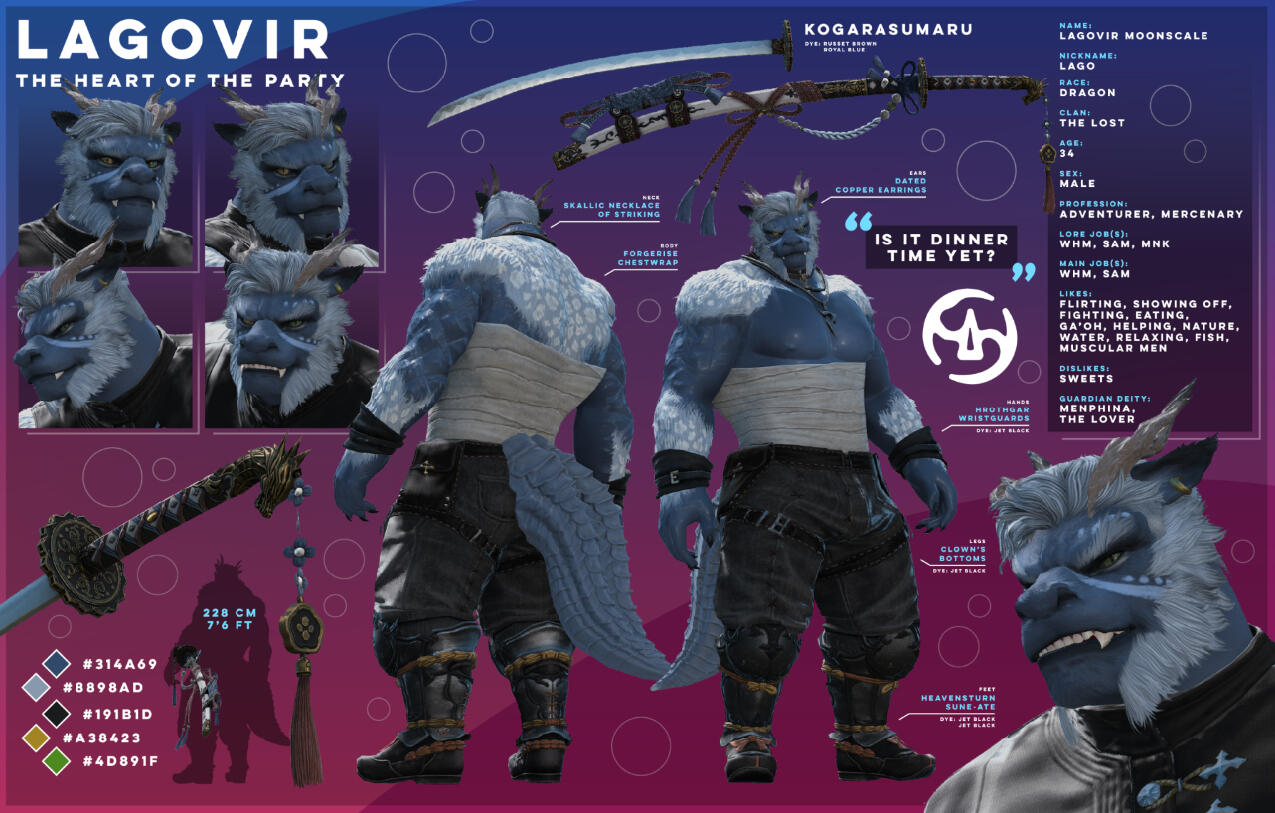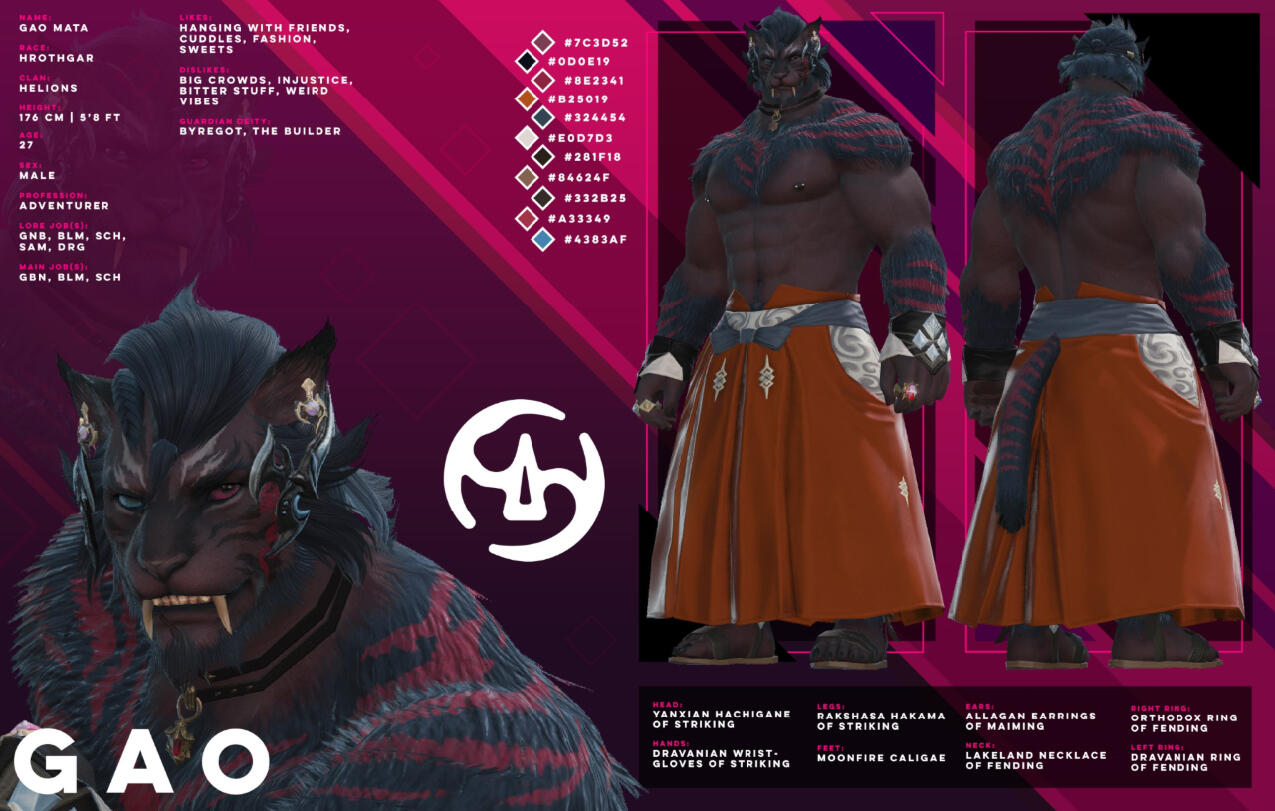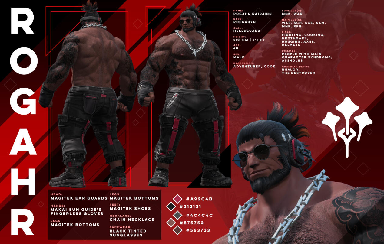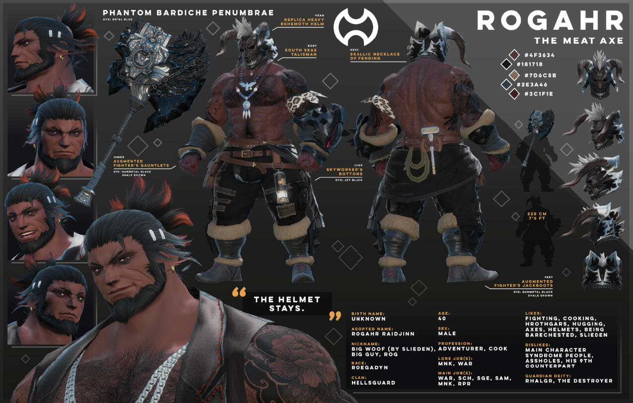 Your big, friendly, helmet-enjoyer roegadyn! I usually do my dailies and Gpose a lot with either my main (Rogahr) or one of my many alts...