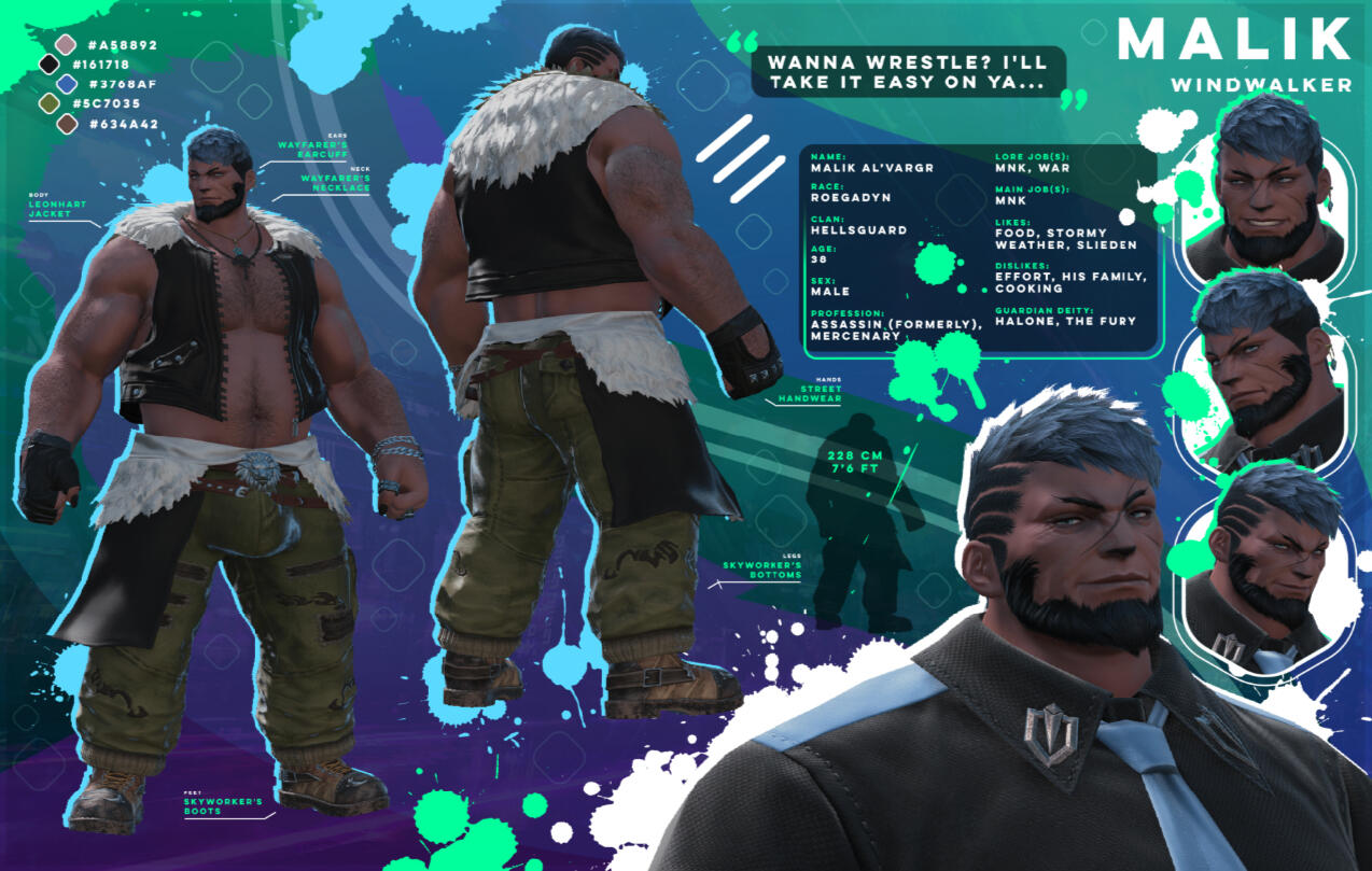 Malgamoth, a wanderer and warrior from the New World. He was challenged by Rogahr and won against him. And is now training him. After some time Malgamoth decides to visit Eorzea by recommendation from his recent pupil. After arriving in La Noscea he meets and befriends a curious wolfgar, Bardou!