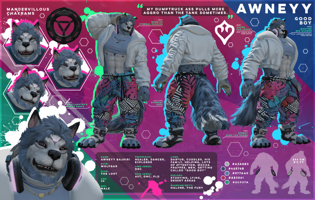Bardou, a very big friendshaped wolfgar who wants to be with his friends more than anything. He became good friends with a duo he met in Limsa Lominsa, he also was inspired to become a warrior just because he kept hearing stories about this Behemoth-helmet-wearing Roegadyn... Funnily enough years later Bardou met him again with his partner. Time has passed again and Bardou befriended an old pink behemoth that he calls Strawberry.
